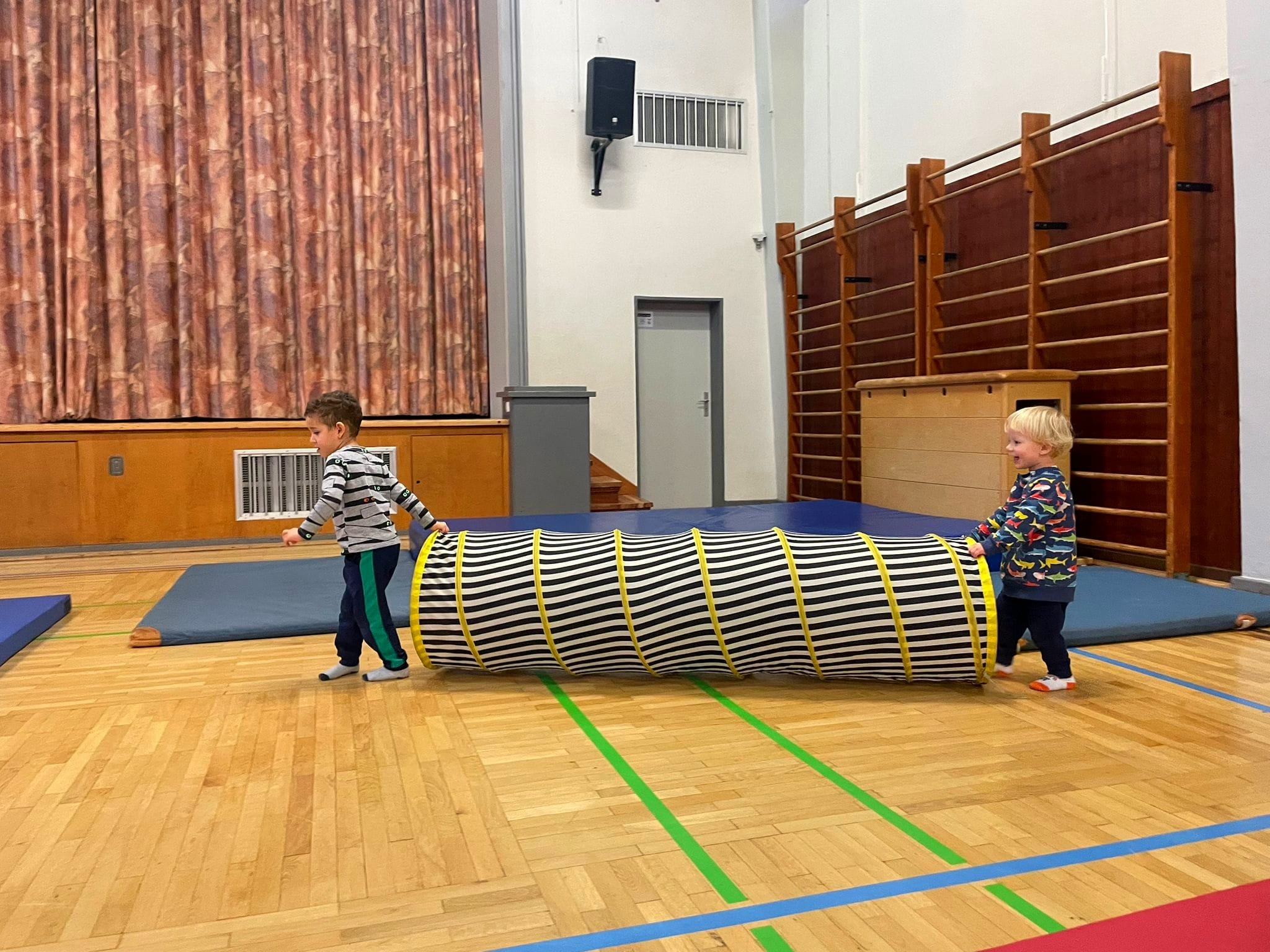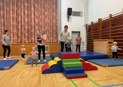 Die Kleinen erhalten mit Unterstützung bzw. Begleitung der Eltern die Möglichkeit, sich in der Bewegungslandschaft im Krabbeln und Laufen, im Klettern und Springen sowie im Schaukeln auszuprobieren. Außerdem lernen die Kleinen hier auch andere Kinder kennen und können schon so früh ihre sozialen Kompetenzen schulen. Erste Freundschaften entwickeln sich und ein Wir-Gefühl entsteht beim Abschlussritual, an dem gemeinsam das Bewegungslied „Teddybär“ gesungen wird.